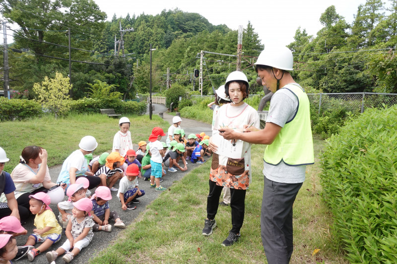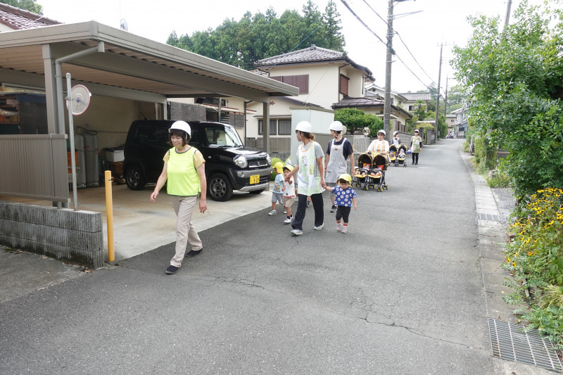 宮ノ平駅までは乳児の足でも10分程度。園長先生を先頭にしクラスごとに避難します。