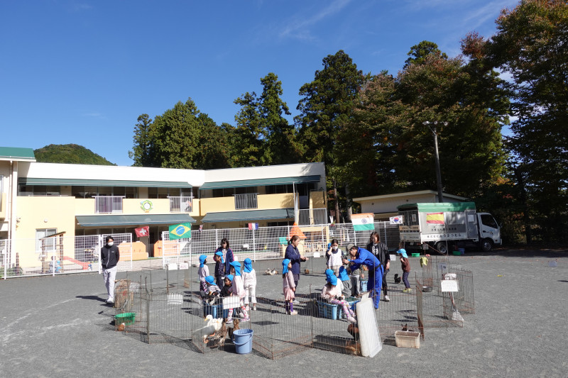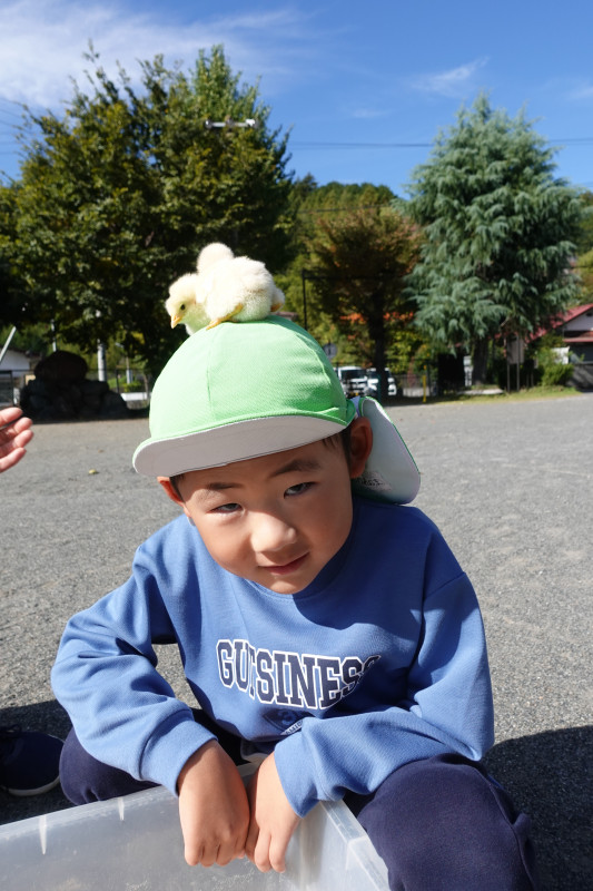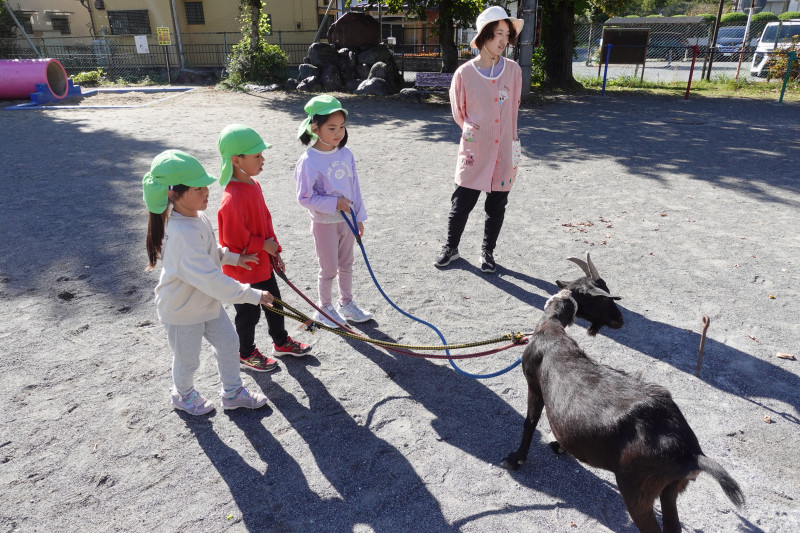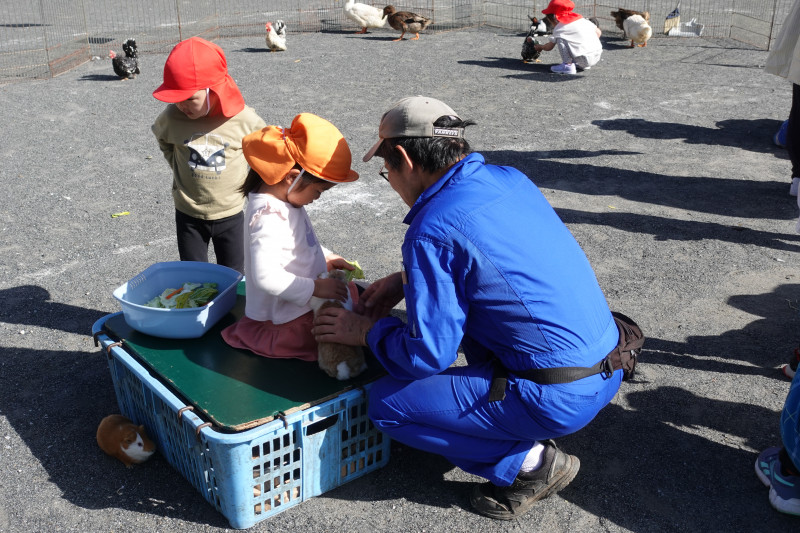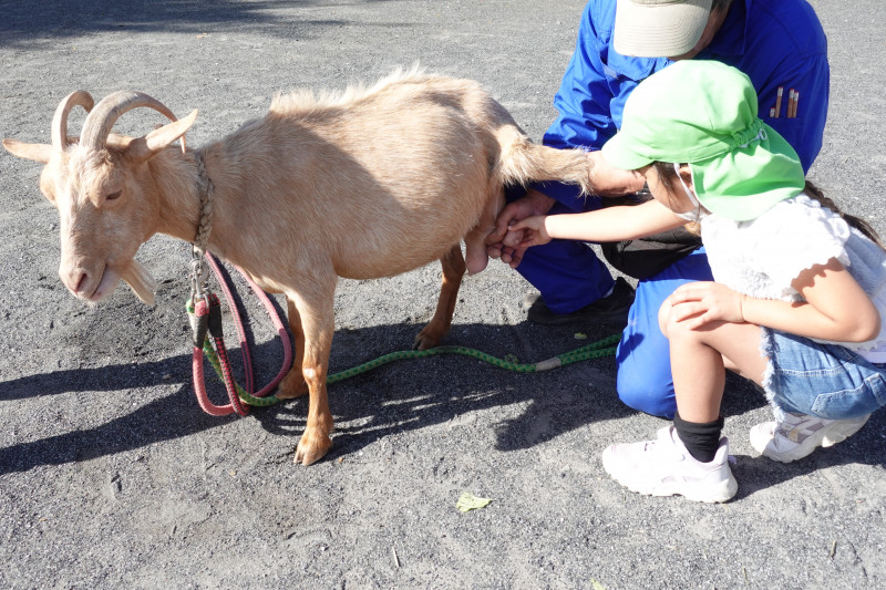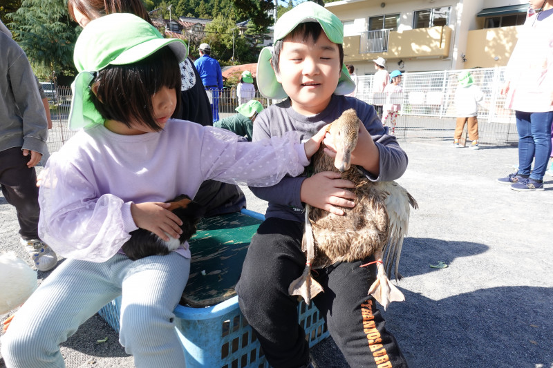 5歳児クラスはヤギの散歩やミルク絞り、アヒルの抱っこや頭に乗せてみたりして、それぞれ積極的に動物と触れ合いを楽しんでいました。