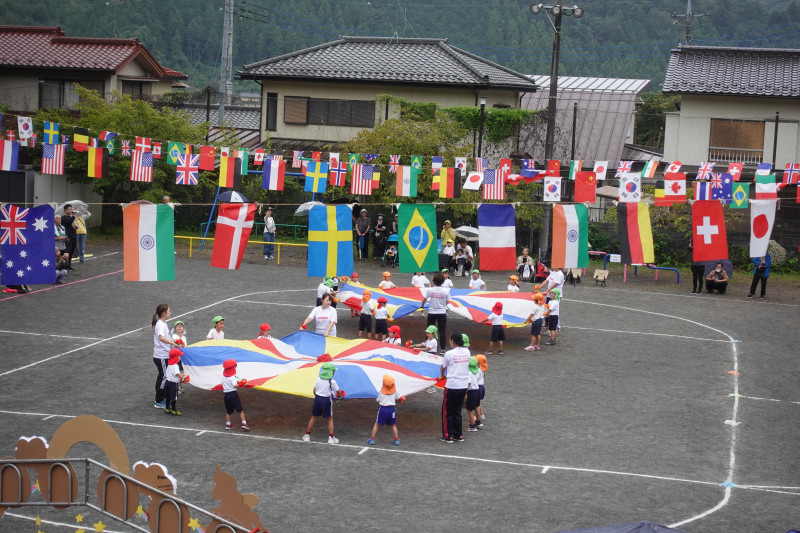 縦割り保育の集大成!3歳児から5歳児みんなで取り組んだバルーンは小雨でバルーンが湿ってしまいましたが、心を一つしてタイミングを合わせて上手にできました。