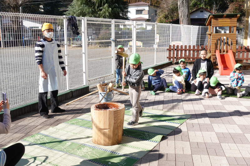 例年4,5歳児だけが参加していた餅つきに3歳児も加わり、みんなで