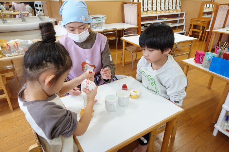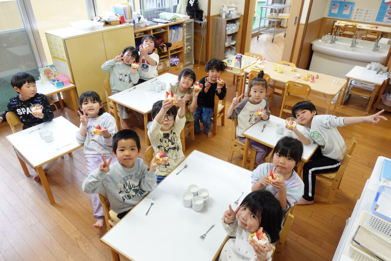 調理室の先生が焼いてくれたフワフワのスポンジにクリーム、イチゴ、カラーチョコのトッピングをしました。