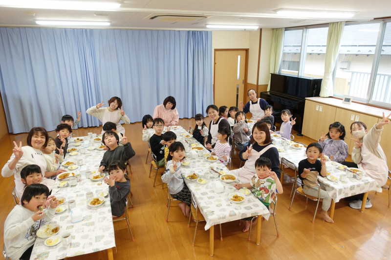 幼児クラスはホールでみんなでお別れ会メニューを食べました。